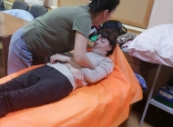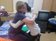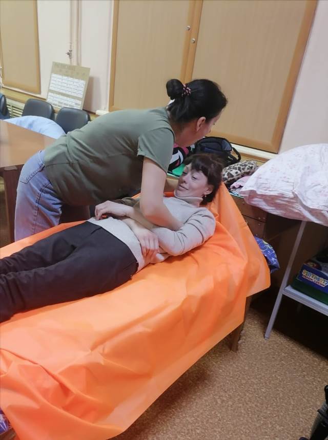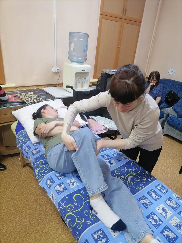 На занятии был организован просмотр небольших видео  о  перемещении маломобильного человека с кровати на коляску, с коляски на кровать, подтягивании к головному концу кровати, поворот на 300,900,1350, использование скользящих простыней для перемещения. Затем все полученные знания отрабатывались на практике. Под четким руководством специалиста обучающиеся пробовали друг на друге провести перемещение с  применением поддерживающего пояса, скользящей простыни, доски для пересаживания и поворотного диска. Для проведения практического занятия было использовано  оборудование, предоставленное комплексному центру фондом «Старость в радость».