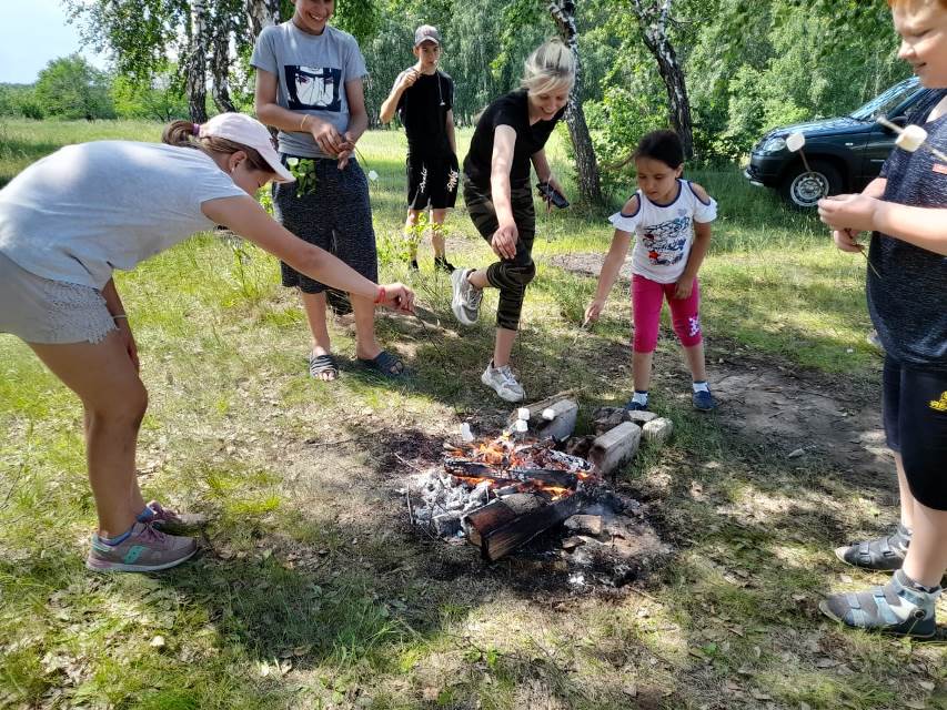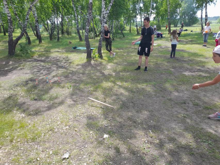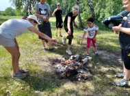 Облюбовав симпатичную полянку среди молодых березок, мы разбили наш лагерь. Назначили дежурных по кухне – ими оказались, конечно, родители. Со знанием дела они вмиг развели костер и поставили вариться в котелке гречневую кашу. Ребята тут же нашли занятия по интересам: кто-то собирал палатку, другие выводили на песке шедевры художественного искусства, а треть и вовсе прилегли на покрывале, просто наслаждаясь прекрасной погодой. Обед не заставил себя ждать! Съев в считанные минуты походную кашу, ребята активизировались на коллективные игра: вышибала, теннис, городки, «крокодил» и др.
