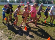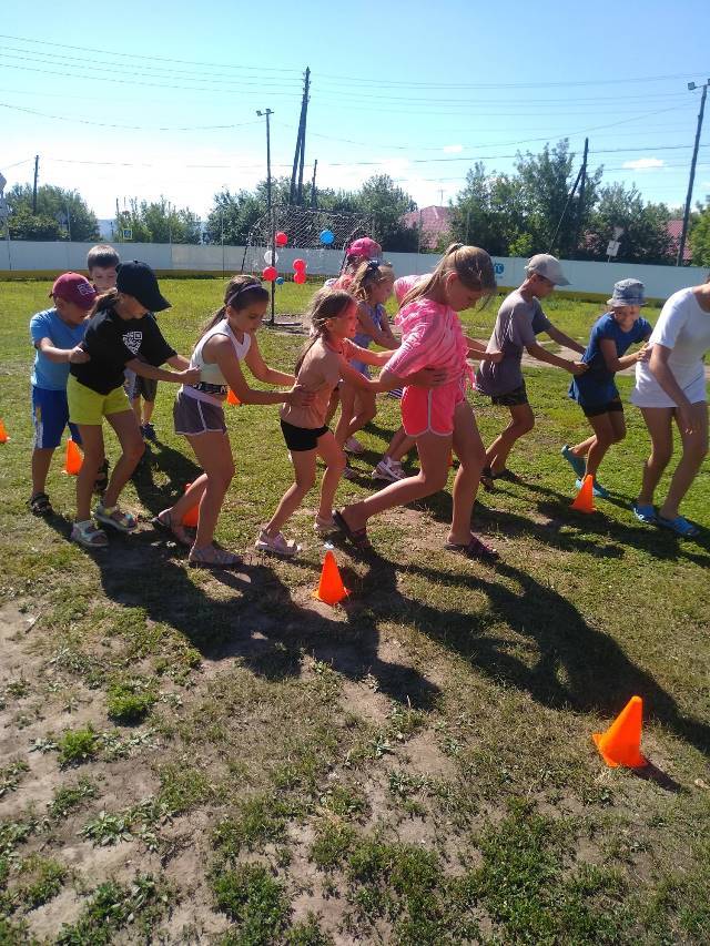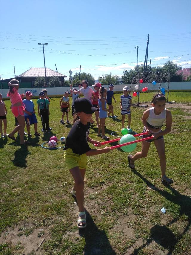 Весело, с командным задором девчонки и мальчишки прыгали по «кочкам» и собирали шишки, переносили мячи на гимнастических палках, надували воздушные шары, а затем на ракетках на качество и скорость их перемещали, водоносы переносили воду, отгадывали загадки о лете.