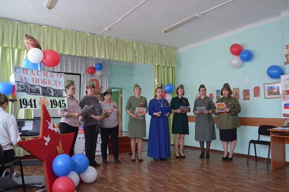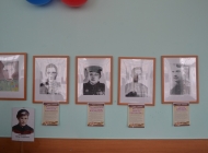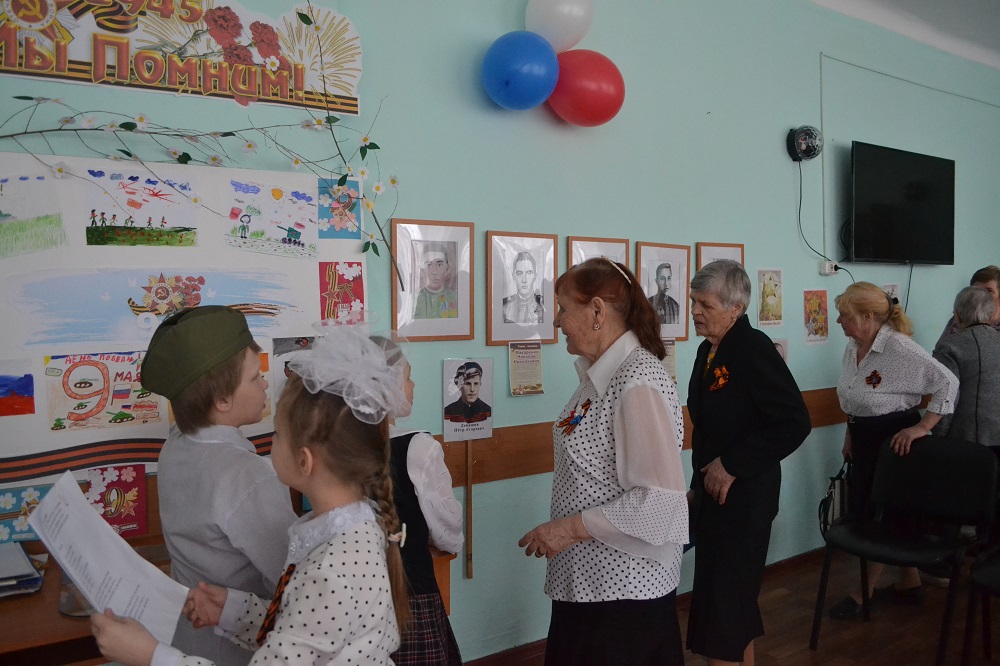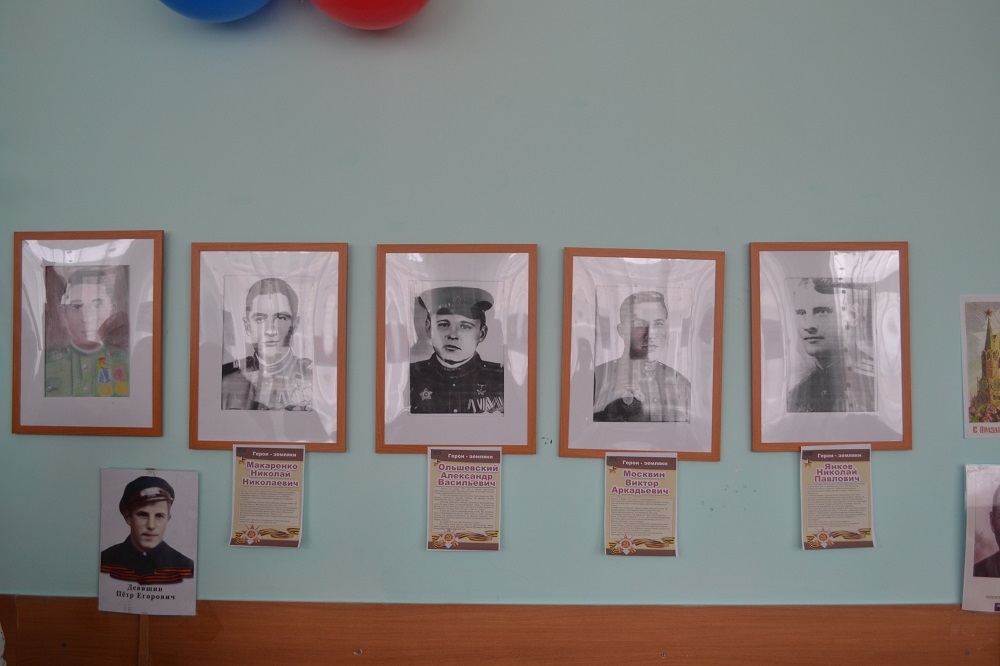 Оформление зала торжественное и очень продуманное: на стенах актового зала расположилась выставка портретов «Бессмертного полка» с описанием биографии наших героев, их подвигов, под стеклом письма солдатов, похоронки с фронта, хранившиеся в семьях наших сотрудников, передававшиеся из поколения в поколение.
