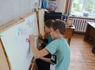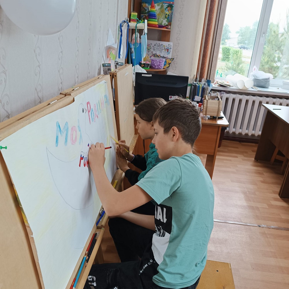 • На творческом занятии «Моя родина – РОССИЯ» прошло коллективное изготовление баннера с изображением «Голубя Мира».