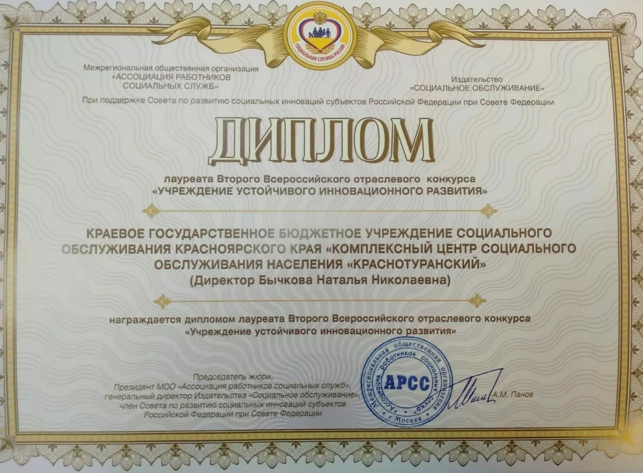 Подведены итоги Второго Всероссийского отраслевого конкурса «Учреждение устойчивого инновационного развития». Комплексный центр социального обслуживания населения «Краснотуранский» вошел в число победителей, став лауреатом конкурса.