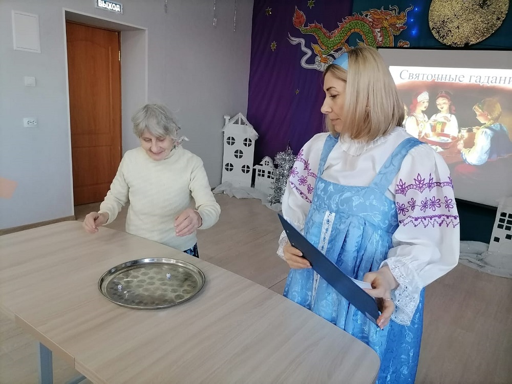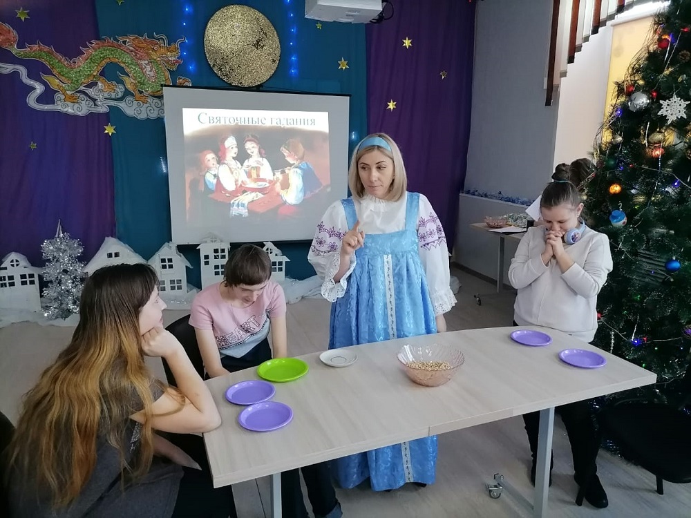 Началась программа с беседы о традициях русского народа в святочные дни, приметах и повериях, которыми весьма богаты зимние праздники. Захватывающим моментом посиделок было таинственное и загадочное святочное занятие - гадание. Каждому хотелось заглянуть в свое будущее, узнать, что же его ожидает: успех в делах, встреча с новым другом, а может интересное путешествие или неожиданное наследство.