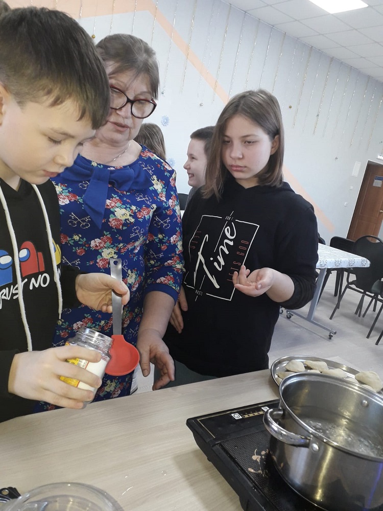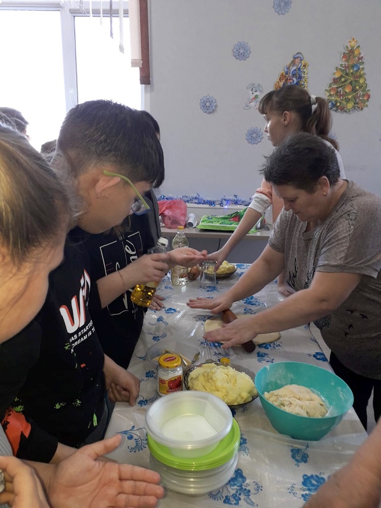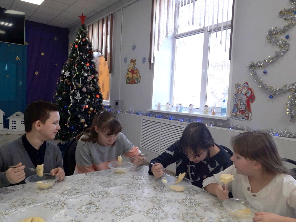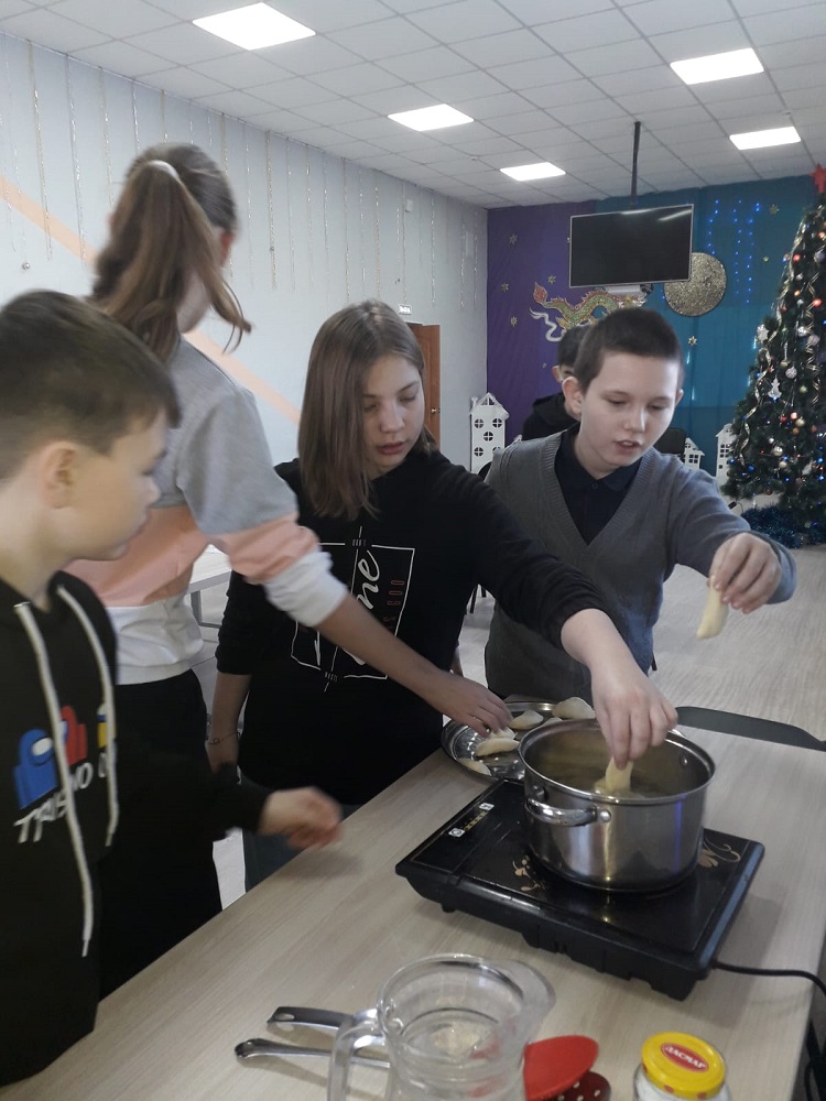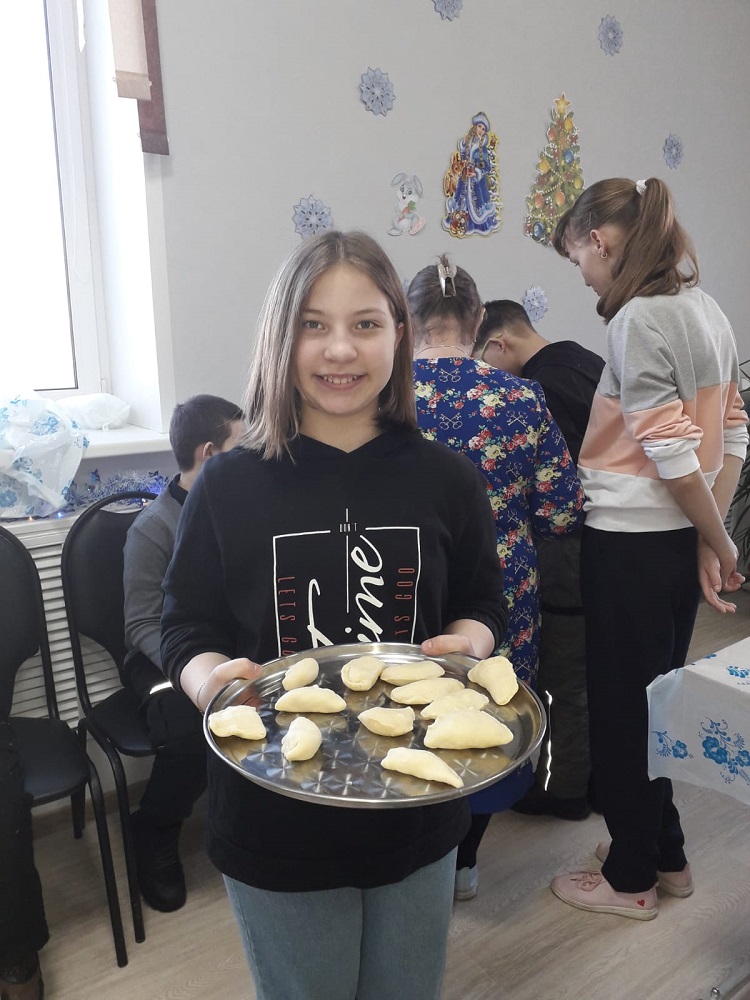 А еще вспомнили один старый традиционный обычай – это лепить и варить вареники. Не просто вареники, а с сюрпризом: кому попался вареник с сюрпризом, у того и сбудется желание. Сюрпризы могут быть разными, но традиция от этого не теряет своей прелести. Ребята, не без помощи родителей, конечно, в полной мере продемонстрировали свои кулинарные способности, а после приготовленное блюдо и отведали.