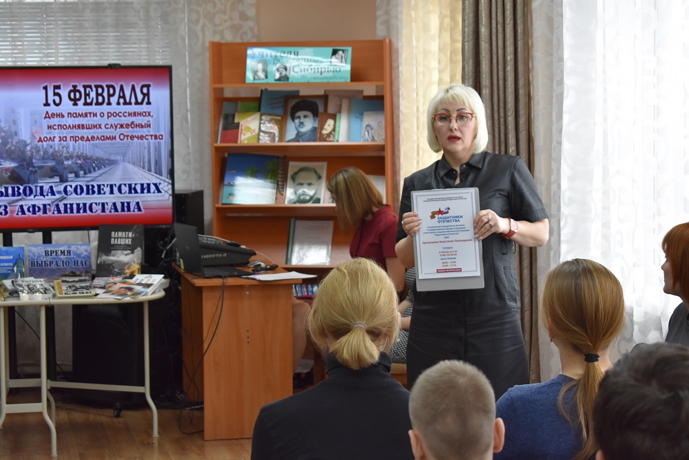 14.02.2024 г. для учащихся Краснотуранской СОШ также было организовано ставшее уже традиционным ежегодное совместное мероприятие КГБУ СО «КЦСОН «Краснотуранский» и Краснотуранской Межпоселенческой центральной библиотеки им. поэта Суворова Г.К. с участием ветеранов боевых действий Афганистана, Чечни, СВО.