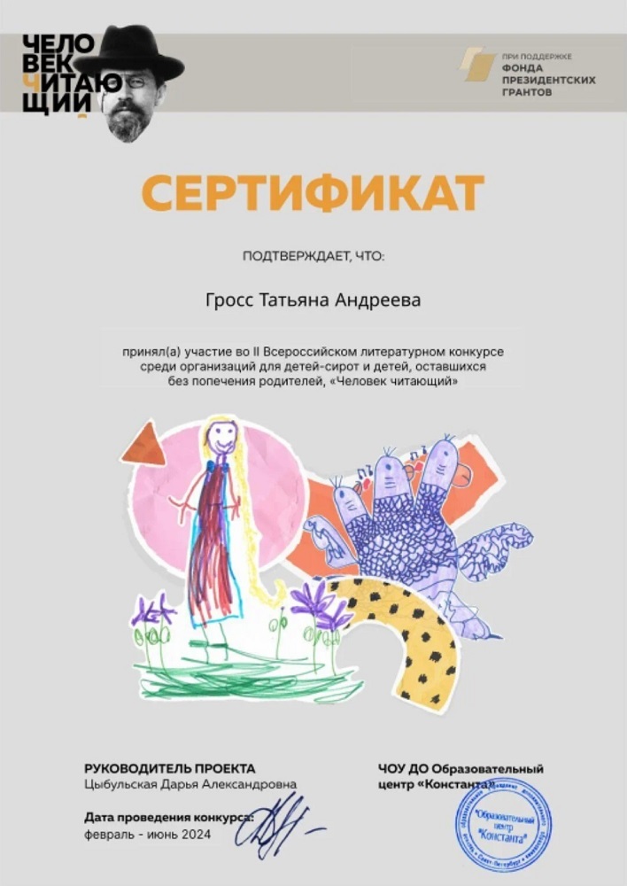 С 19 по 30 марта 2024 года воспитатели социально-реабилитационного отделения для несовершеннолетних КГБУ СО «КЦСОН «Краснотуранский» совместно с воспитанниками приняли участие во Всероссийском литературном конкурсе для детей-сирот и для детей, оставшихся без попечения родителей "Человек читающий". Проект проходит при поддержке Фонда Президентских грантов.