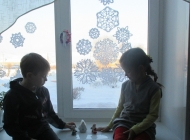 Дети создавали новогоднюю сказку на окне. Предварительно дети учились вырезать ажурные снежинки. Затем наклеили их на стекло в форме ёлки, под которой нашли свое место дед Мороз и Снегурочка, слепленные из пластилина, и их домик из ваты. А за окном, в глубоких холодных сугробах, была выложена гирлянда из сверкающих разноцветных ледяных шаров, заменивших хрустальные бусы. Участники мастер-класса почувствовали себя волшебниками. Сказка пришла в назначенное время.