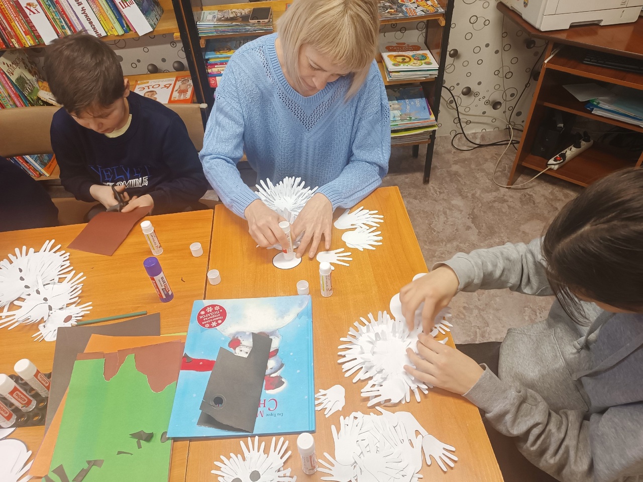 Совместно со специалистами детской библиотеки были проведены мастер-классы по изготовлению рождественских ангелочков и объемных снеговиков «дружбы» из ладошек.
