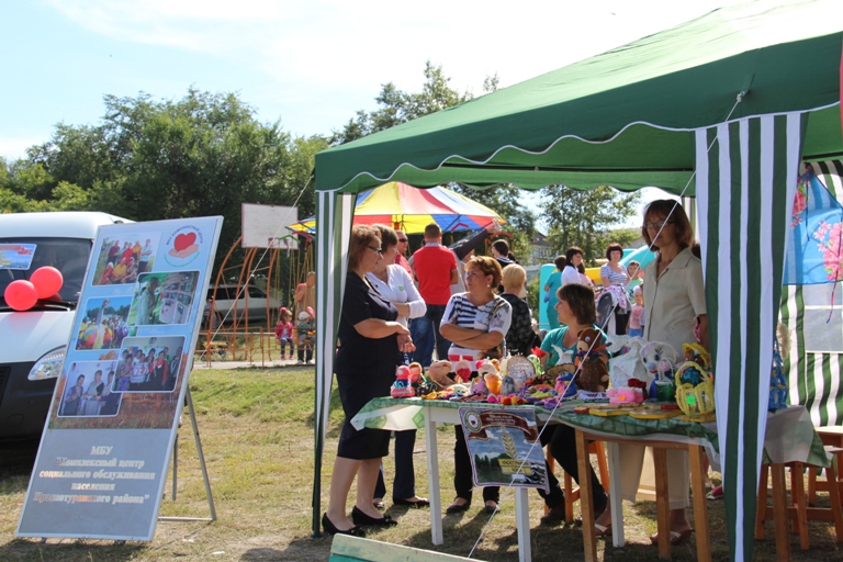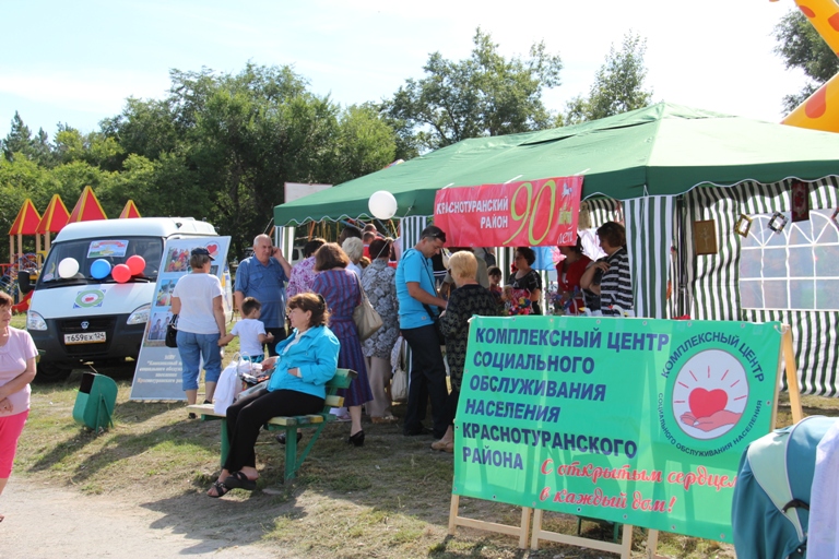 Праздник малой родины начался с фестивального шествия, МБУ КЦСОН Краснотуранского района было представлено большой, нарядной колонной с символикой, разработанной специально для юбилейной даты Краснотуранского района. На центральной площади была организована площадка с выставкой декоративно–прикладных изделий. Всем гостям праздника вручались поздравительные буклеты и открытки.