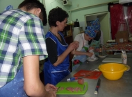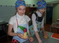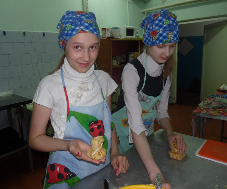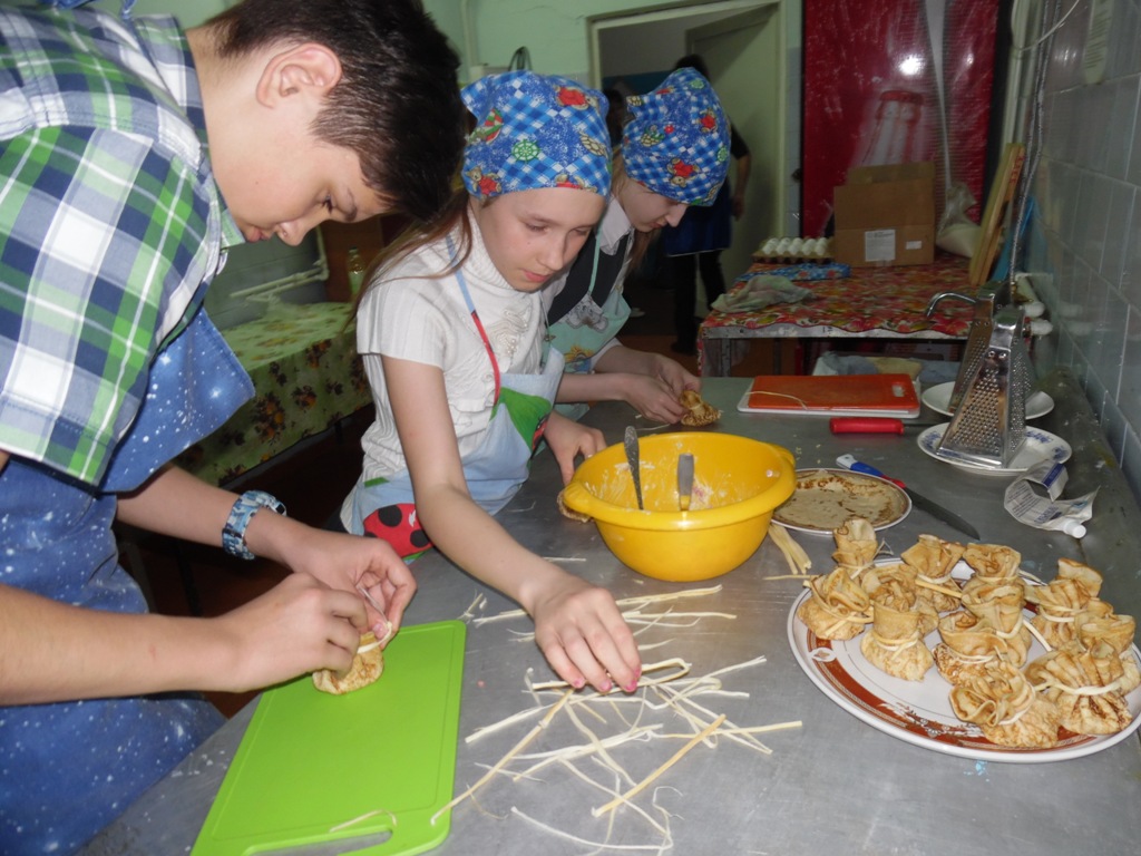 Освежив в памяти правила безопасности труда, и, тщательно вымыв руки, дети приступили к изготовлению блинных мешочков с начинкой. Мастер техникума Татакаева Анастасия Григорьевна заранее испекла блины, а детям предстояло изготовить начинку и нафаршировать их. Дети самостоятельно натерли сыр и мелко нарезали колбасу, все перемешали, заправив майонезом, приступили к формированию блинных мешочков.