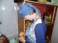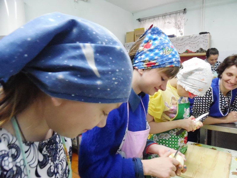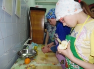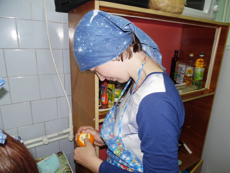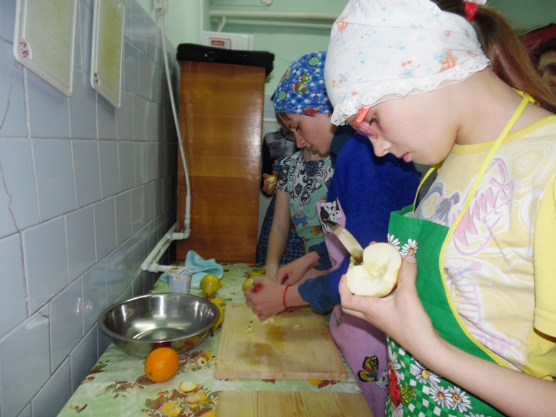 Повторив правила безопасности труда и помыв руки, дети приступили к изготовлению фруктового салата. Фруктовый салат – это блюдо, приготовленное из ассорти свежих фруктов. Мы приготовили для салата яблоки, груши и апельсины. Мастер техникума, Анастасия Григорьевна, рассказала, что перед тем, как готовить фруктовый салат, надо помыть фрукты, очистить их от кожицы, зерен и косточек и затем нарезать. Мастер показала, как правильно это делать. И дети приступили к изготовлению: самостоятельно очистили фрукты и нарезали их мелкими кубиками. Потом залили йогуртом и перемешали. В качестве украшения и как ингредиент сладкого блюда салат был украшен горячим шоколадом.