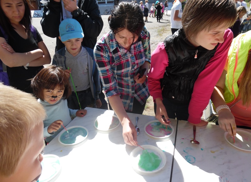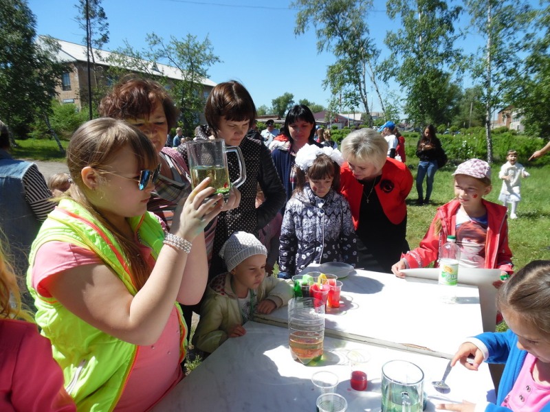 Программа праздника была очень обширная, работали игровые, познавательные, художественные и спортивные площадки. Детям были представлены интересные занимательные эксперименты с красками, которые превращались в фокусы. Юным художникам была предоставлена возможность нарисовать пальчиковыми красками неповторимые шедевры. Детский боди-арт подарил детям сказочное перевоплощение.