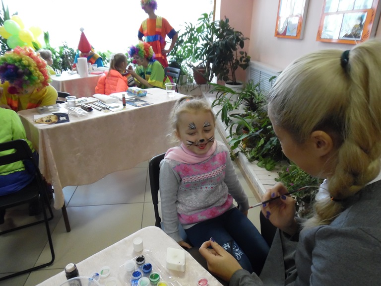 Детей приветствовали веселые клоуны, гримеры проводили мастер-класс по гриму. Прекрасный актерский состав порадовал детей спектаклем «Молодильные яблоки».