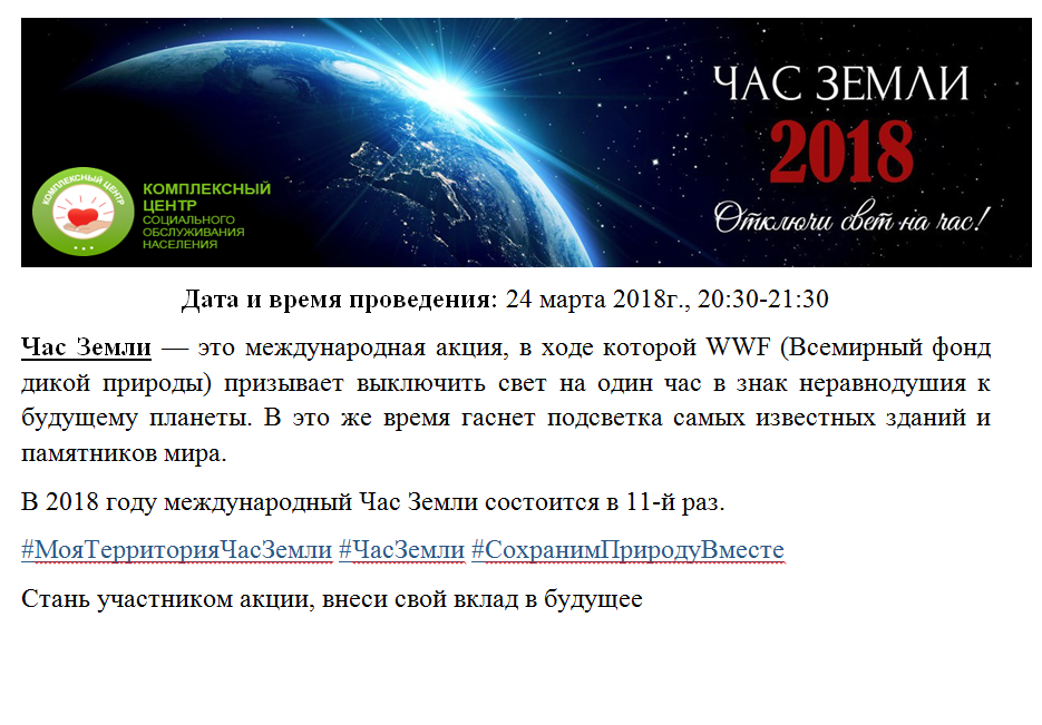 Специалисты организационно-методического отделения МБУ КЦСОН Краснотуранского района приняли участие в международной акции «Час Земли».