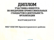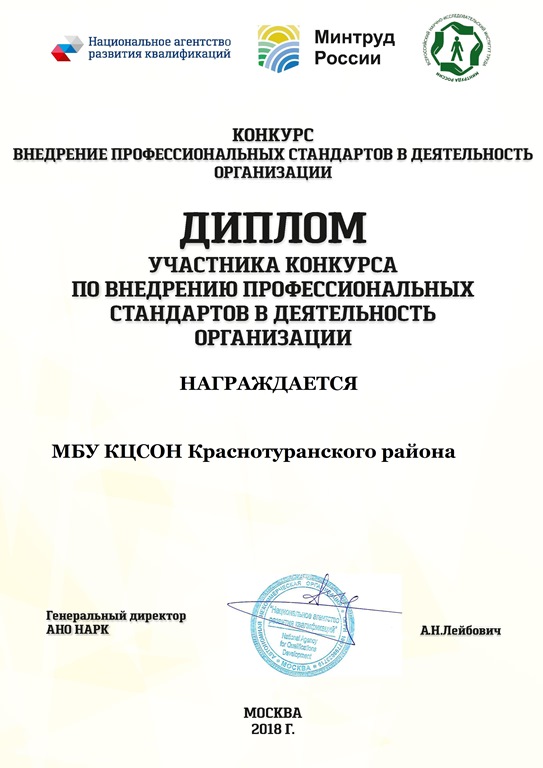 Муниципальное бюджетное учреждение «Комплексный центр социального обслуживания Краснотуранского района»  приняло участие в конкурсе  «Внедрение профессиональных стандартов в деятельность организации», впервые организованного Национальным агентством развития квалификаций и ФГБУ «ВНИИ труда» Минтруда России под эгидой Министерства труда и социальной защиты Российской Федерации и стало дипломантом конкурса.
