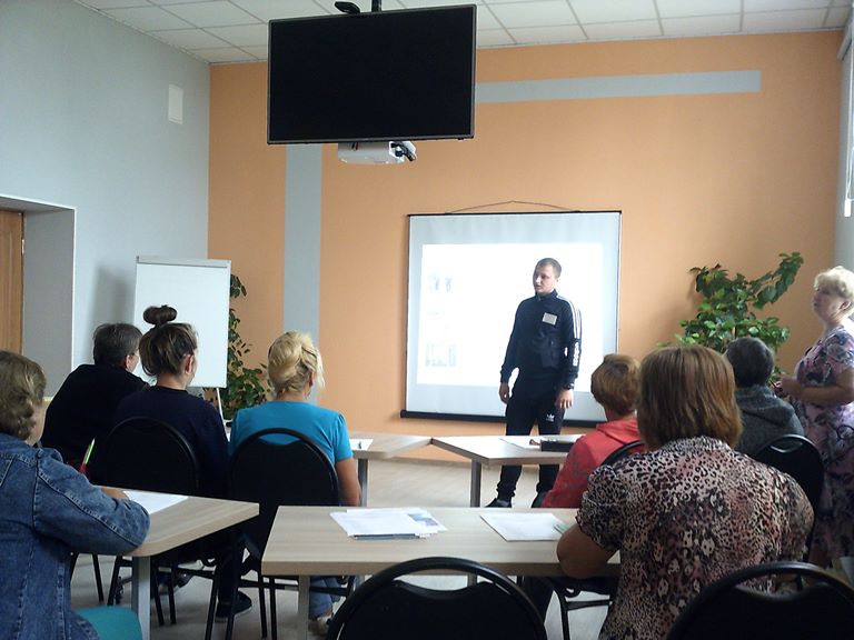 Инструктор по адаптивной физкультуре отделения ОВЗ Бортновский А.В. рассказал как избежать ошибок при выполнении физических упражнений и наглядно показал,  какие физические упражнения рекомендованы разным группам пожилых людей: маломобильным, среднемобильным и активным. Андрей Владиславович обратил внимание слушателей на то, что обязательно нужно обращать внимание на состояние здоровья получателя социальных услуг.