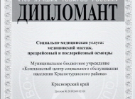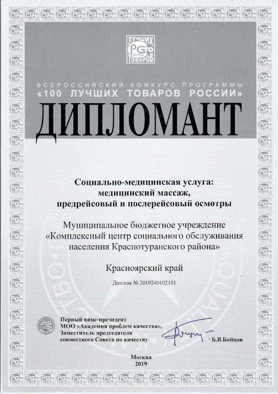 В 2019 году МБУ КЦСОН Краснотуранского района стало дипломантом конкурса в номинации «Услуги для населения» с дополнительными социальными услугами по медицинской деятельности: медицинский массаж, предрейсовый и послерейсовый осмотр.