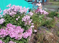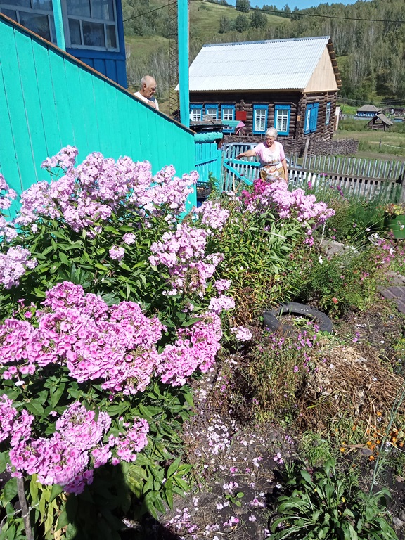 У нас на обслуживании находится семейная пара Филиппова Ф.О. и Головач Н.Ф. Очень добрые приветливые люди, настоящие кропотливые труженики своего дела. В их доме царит особенная душевная атмосфера. Очень любят флоксы. Огромными шапками разного цвета цветет этот цветок. Вся усадьба благоухает в цветах.