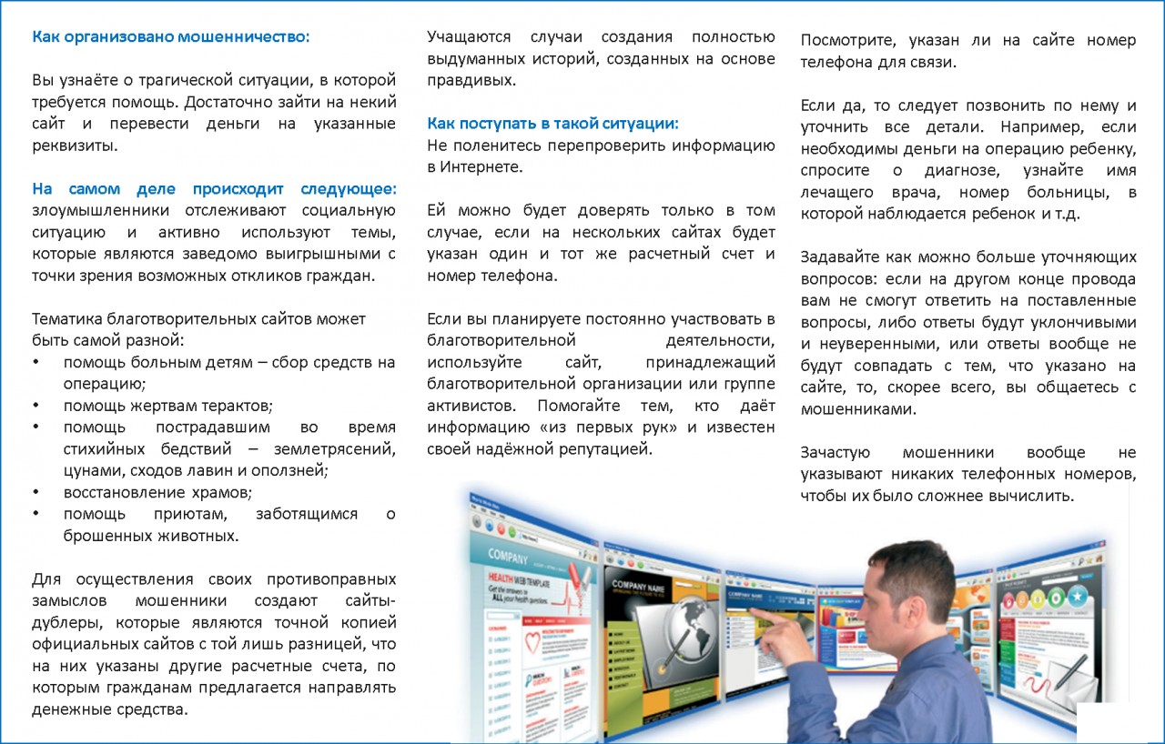 13.03.2023 г. в КГБУ СО "КЦСОН "Краснотуранский" в социально-реабилитационном отеделении для граждан пожилого возраста. инвалидов и детей с ОВ прошло очередное мероприятие по профилактике финансового мошенничества. На сегодняшний день Интернет является очень эффективным инструментом для использования его в благотворительных целях. Развитие электронных кошельков и расширение возможностей по перечислению денежных средств, упрощает участие в благотворительной деятельности для каждого пользователя Интернета. Одновременно злоумышленники приспособились использовать сбор средств на благотворительных сайтах в своих мошеннических схемах.