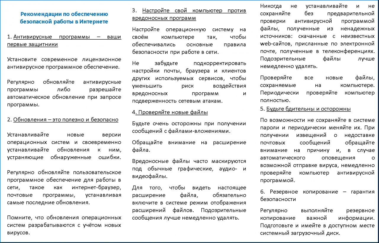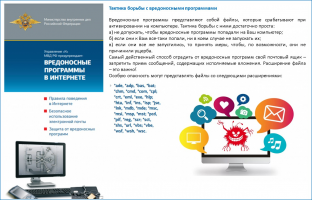 Интернет называют «миром новых возможностей». Но тем, кто только пришёл в этот мир, следует вести себя осторожно и строго следовать правилам поведения в Сети. Как и в реальном мире, в Интернете действует множество мошенников и просто хулиганов, которые создают и запускают вредоносные программы. Вредоносные программы способны самостоятельно, то есть без ведома владельца компьютера, создавать свои копии и распространять их различными способами. Подобные программы могут выполнять самые разнообразные действия: от вполне безобидных «шуток» (типа «гуляющих» по монитору картинок) до полного разрушения информации, хранящейся на дисках компьютера. Управление «К» МВД РФ напоминает: для защиты пользователей от вредоносных про - грамм разработано множество действенных контрмер. Надо лишь знать их и своевременно использовать.