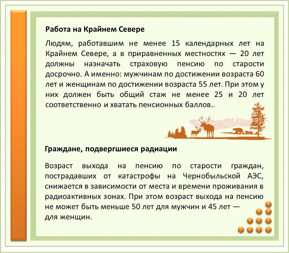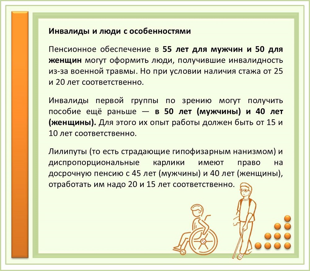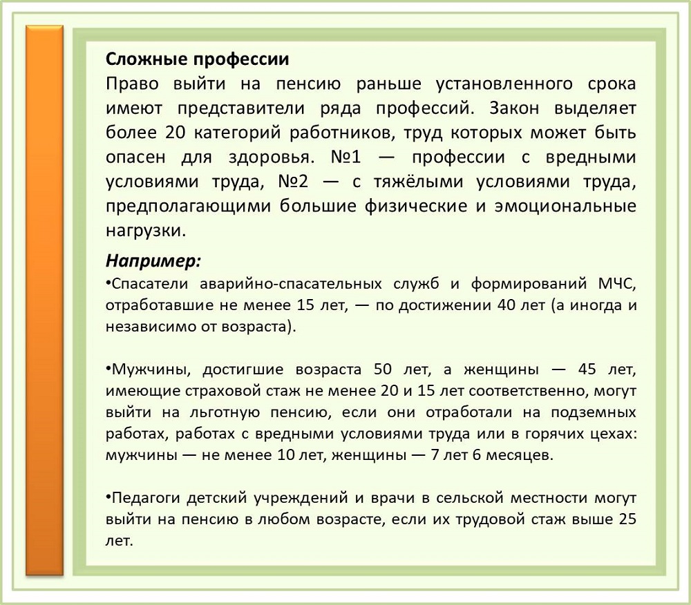 Однако законодательство позволяет некоторым категориям граждан оформить страховую пенсию ранее общеустановленного пенсионного возраста. Право на неё может быть обусловлено родом занятий, профессией или должностью, местом осуществления трудовой деятельности, семейным положением или состоянием здоровья, а также другими факторами.