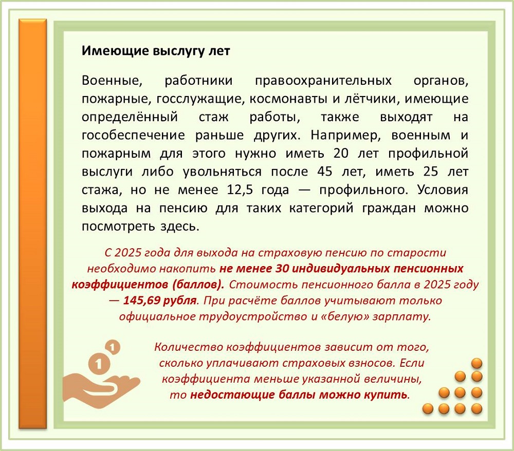 Как правило, для получения льготной пенсии недостаточно найти свою профессию или соответствующий социальный статус в законе. Во всех случаях пенсия назначается только тем, кто заработал необходимое количество пенсионных баллов. Также требуется соблюдение целого ряда других условий, изложенных в разных правовых актах.